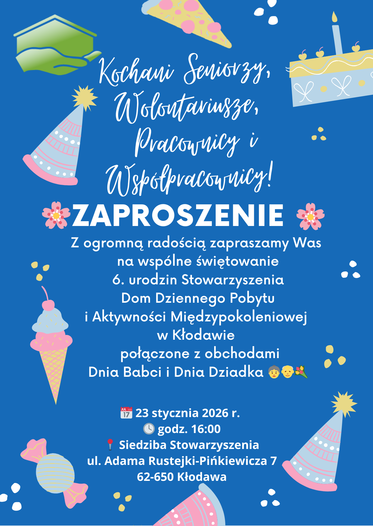 Zaproszenie na 6 urodziny Stowarzyszenia Dom Dziennego Pobytu i Aktywności Międzypokoleniowej w Kłodawie połączone z obchodami Dnia Babci i Dnia Dziadka